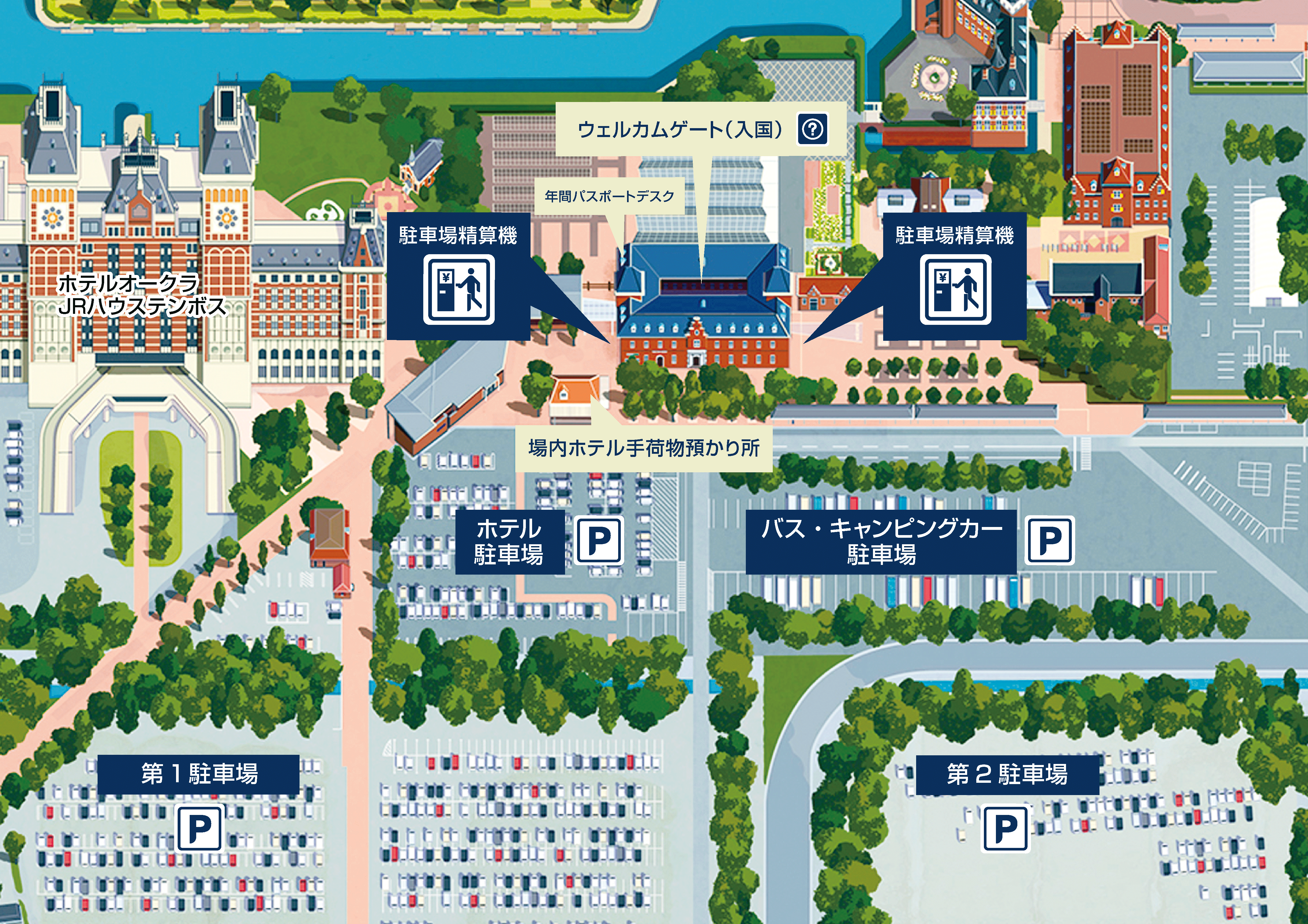 ※주차 증명서는 입국 인포메이션 주변에 설치되는 정산기로부터 발행이 필요합니다. 입장시 반드시 사전에 발행해 주십시오. 덧붙여 주차 증명서의 발행에는, 정산기에의 차번 입력이 필요합니다.