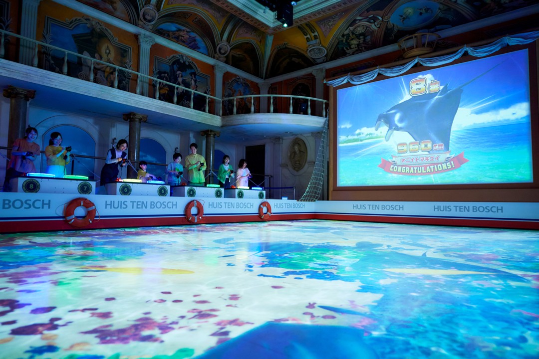 보기만 해도 압도될 만한 약 520인치(약 6.5m×11.5m)의 스크린 속을 거대한 물고기가 헤엄쳐 다니는 세계 최대급의 디지털 어트랙션은,