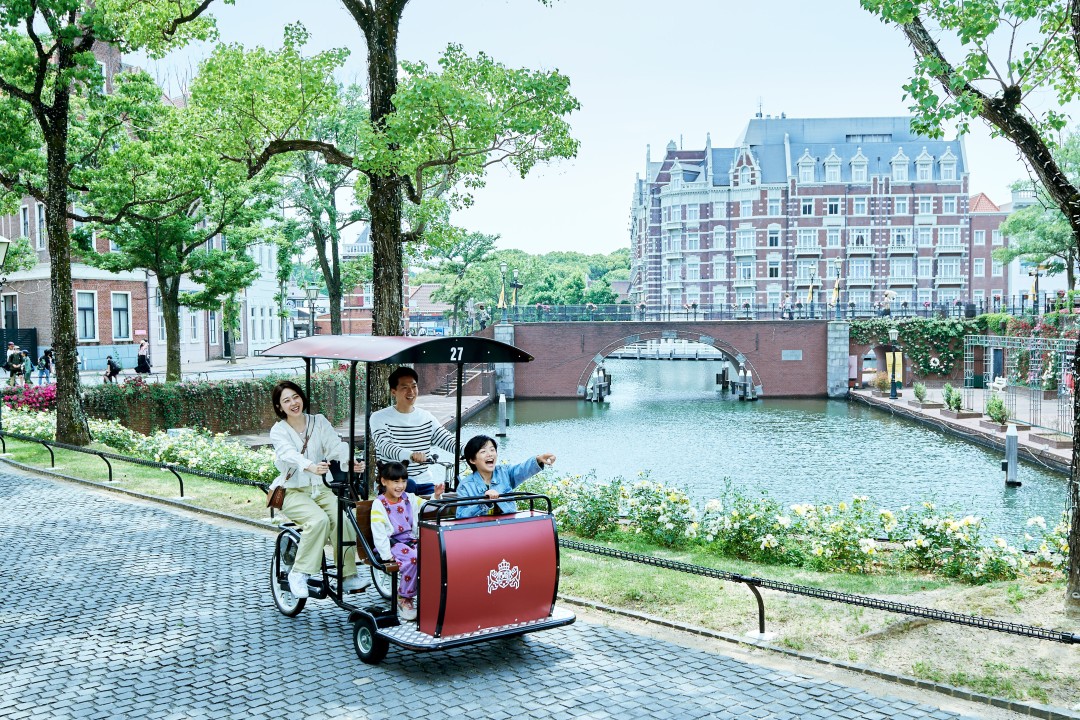 네덜란드어로 자전거를 의미하는 자전거 대여점「핏츠」는 웰컴에리어의 입국점과 하버타운의 항구거리점 2 점포. 1인승은 물론 2인승이나 4인승의 자전거도 다수 준비되어 있습니다. 타는 것만으로도 즐거운 자전거로 공원을 돌아보지 않으시겠어요?
