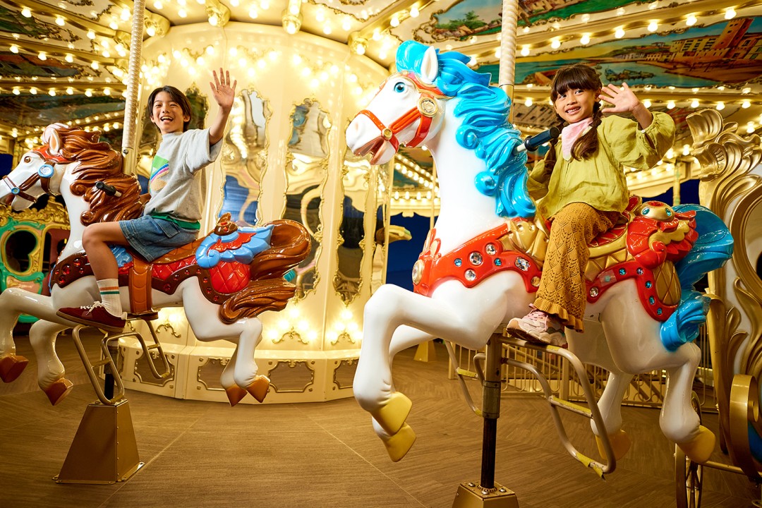 神話をイメージした華やかな世界観を堪能できる、日本初の3階建てメリーゴーラウンド。世界最大級の高さ15mを誇り、イタリア製の馬車やゴンドラはまさに芸術品。昼と夜でまったく異なる表情を見せてくれるのも魅力のひとつ。3階からはハウステンボスの街並みを一望できます。