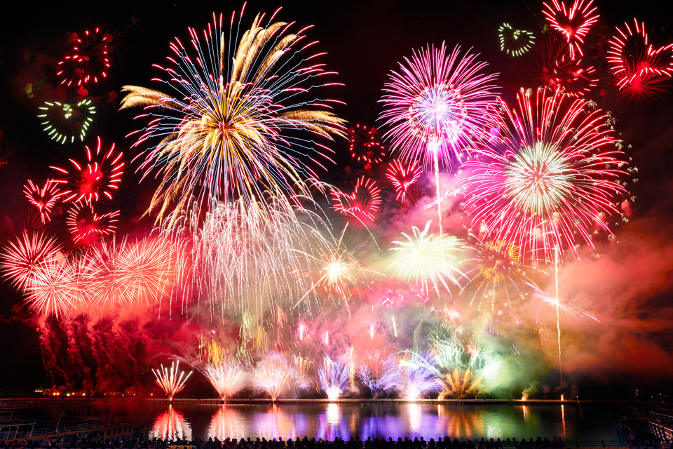 겨울 노래에 따라 화려한 불꽃놀이가 성야의 밤하늘을 장식합니다.