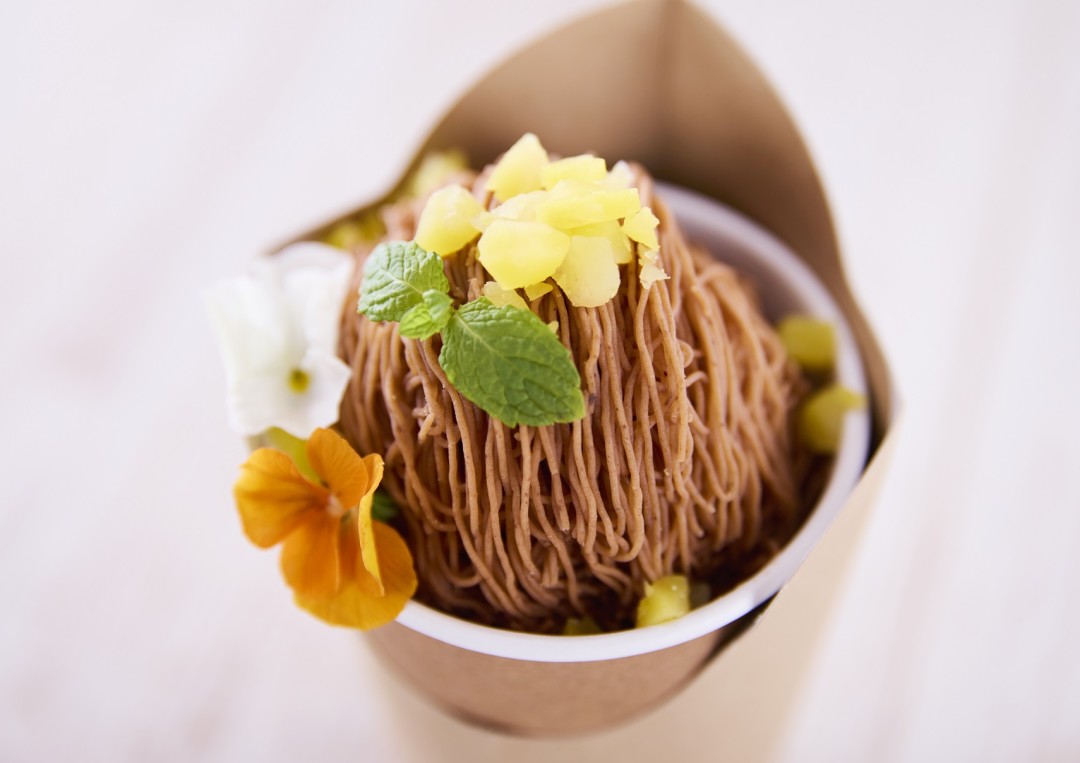 원컵 사이즈의 몽블랑.페이스트를 고집한 달콤한 크림이 특징적. 테이크 아웃하여 걸으면서 먹는 즐거움도◎음료와 세트로 100엔 할인【알레르기:밀, 우유, 계란】