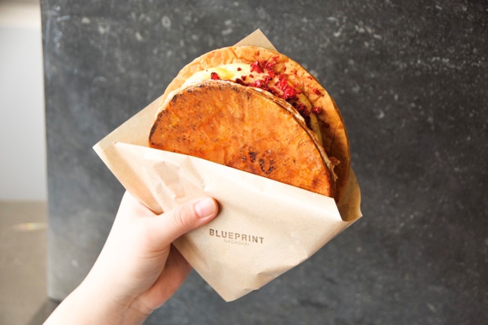 当店で焼き上げたパイ生地にカスタードクリームとミックスベリー・フランボワーズのソースを挟んで、仕上げにパイ生地の表面をカラメリゼして仕上げました