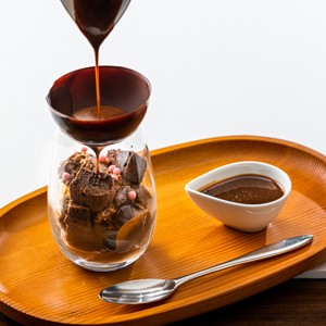 초콜릿의 돔 위에서 따뜻한 초콜릿 소스를 내리면 돔 초콜렛이 녹아 아이스와 얽혀 절묘한 맛! "빛나는"초코 파르페.