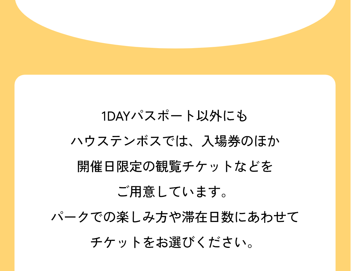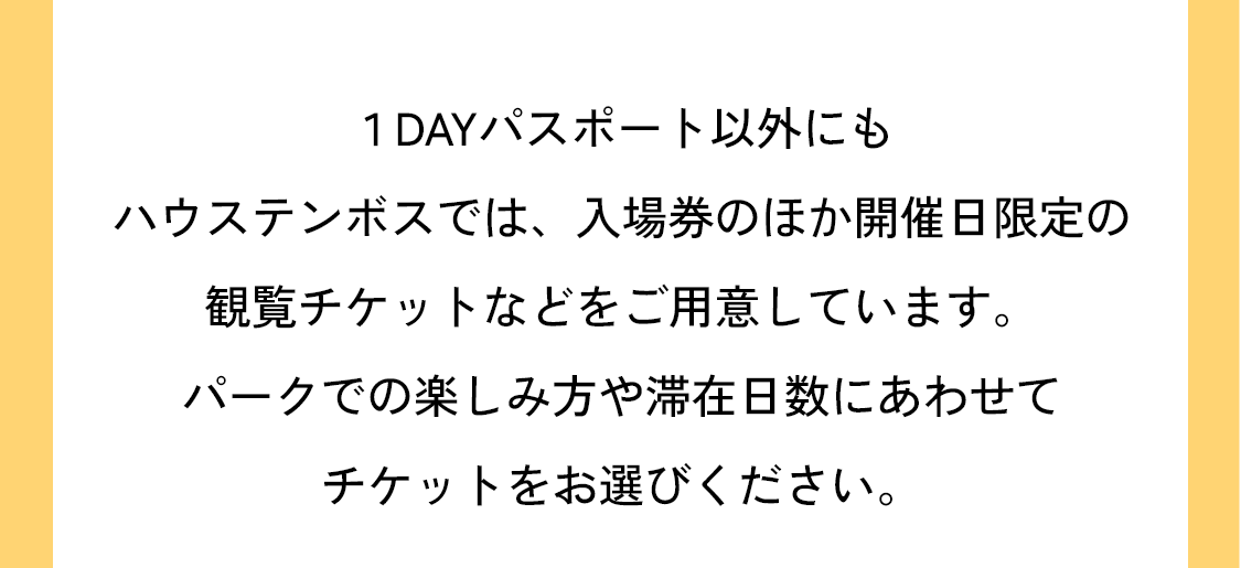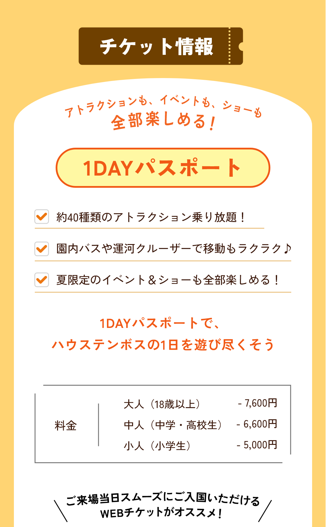 ※ホテルアムステルダムご宿泊の方は、時間を問わずご入場いただけます。(ハーバータウンエリアは開園1時間前より入場可能)